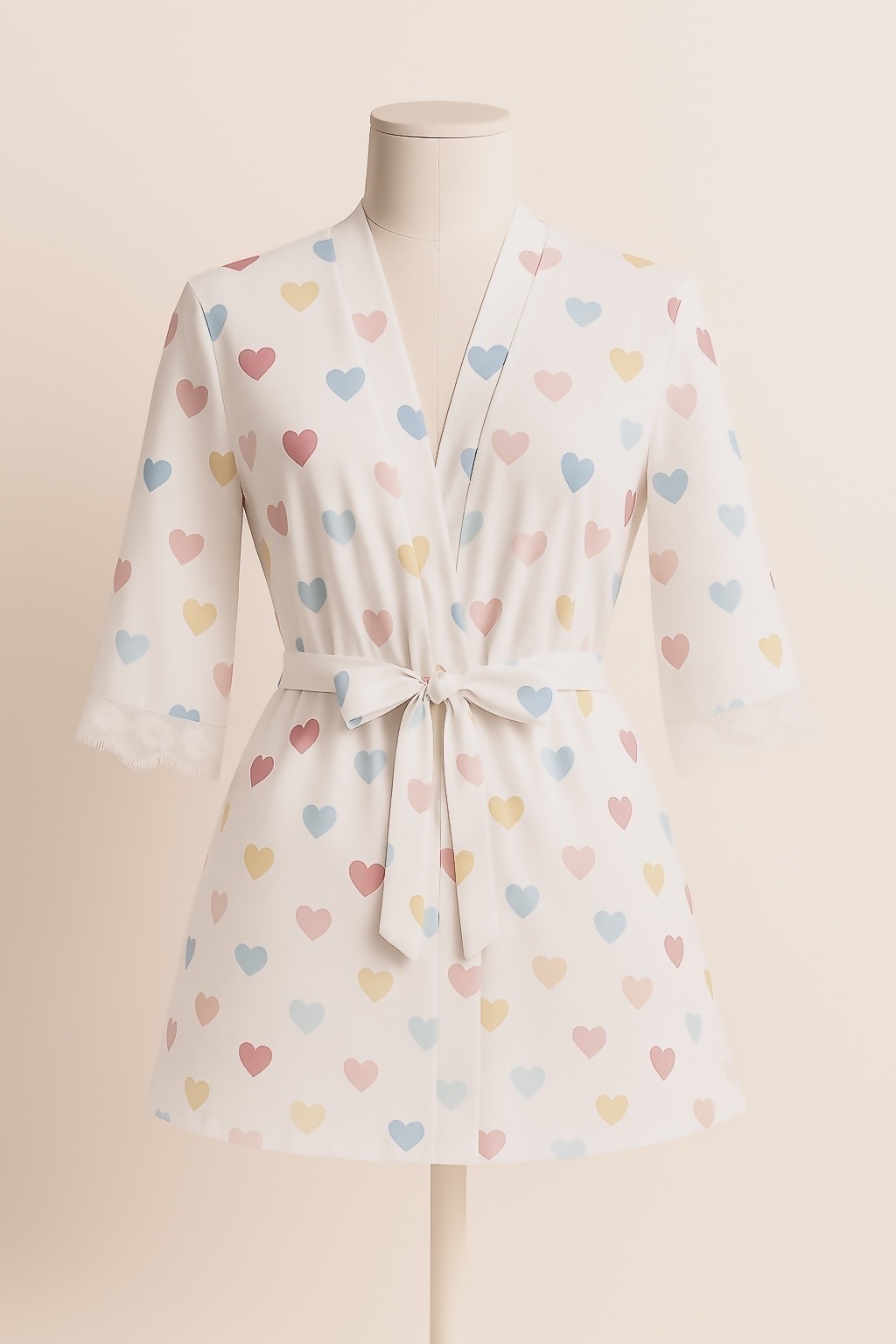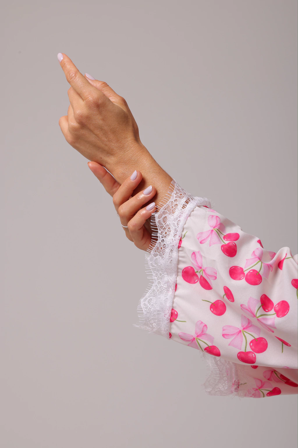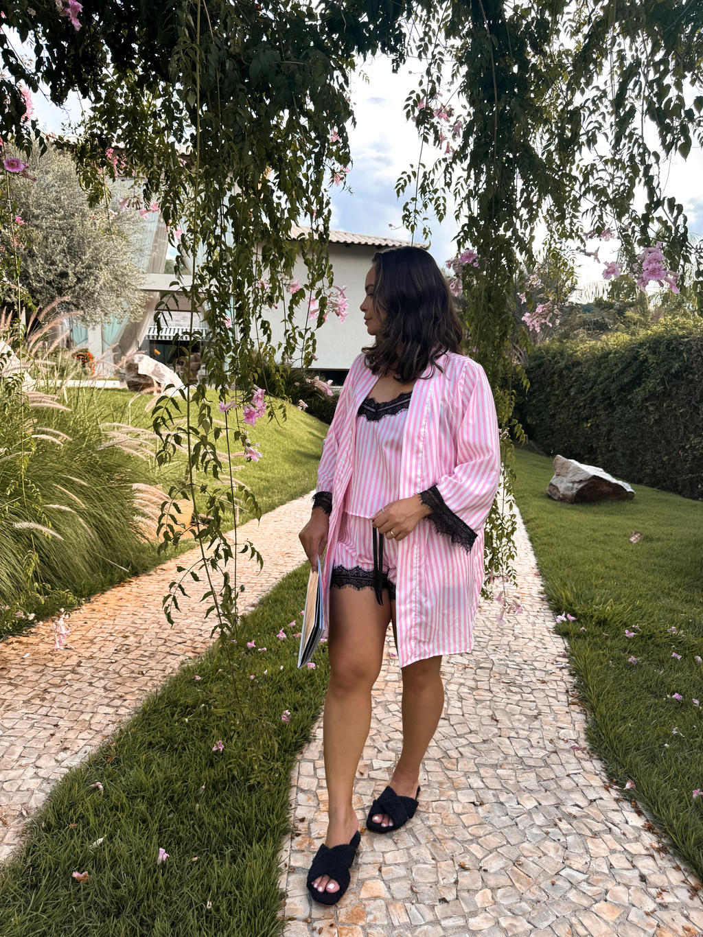 Confeccionado em sedinha macia com estampa listrada e acabamento em renda chantilly nos punhos, o Robe Princess une leveza, elegância e conforto. Possui modelagem reta, mangas 3/4 e acompanha faixa para amarração na cintura, permitindo ajuste ideal ao corpo.
